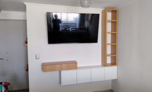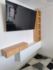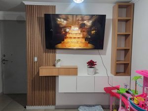 Su diseño mural optimiza el espacio, permitiendo una instalación limpia del televisor y ofreciendo superficies de apoyo y almacenamiento oculto para mantener el ambiente visualmente despejado. Los compartimentos flotantes son ideales para organizar dispositivos electrónicos, objetos decorativos o accesorios, mientras que el panel listonado aporta textura y carácter al ambiente.