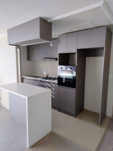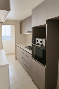 Fabricados en tonos neutros aportando amplitud visual y elegancia atemporal. Los módulos altos y bajos permiten un excelente aprovechamiento del almacenamiento, integrando horno empotrado, campana y encimera de forma armónica y eficiente.